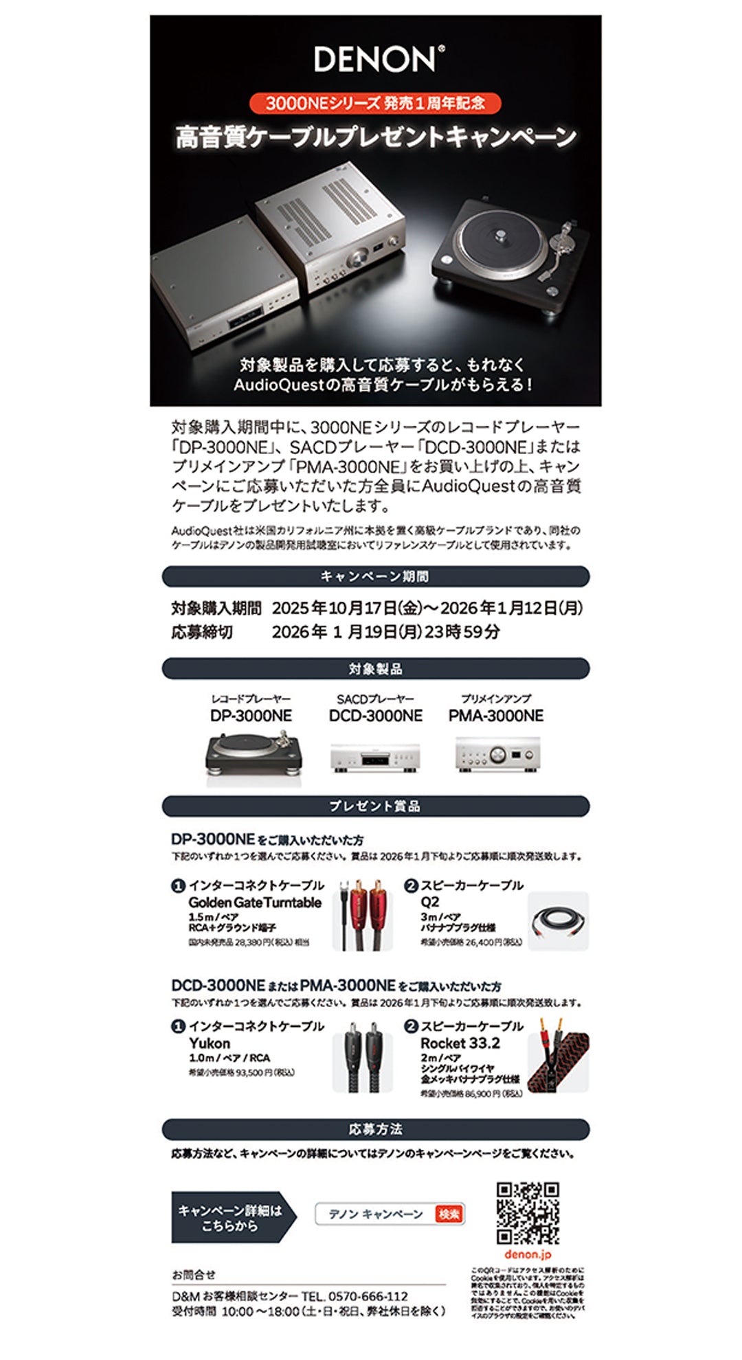 1970年代に民生オーディオ機器市場への参入を果たしたデノンの爆発的ヒットモデル「DP-3000」。 デノンの原点の一つとも言えるDP-3000の誕生からおよそ半世紀の時を経て、これまで培われてきた技術と設計思想による物理的な正確性と、現代のサウンドマスターの鋭敏な感性が融合して生まれたのが「DP-3000NE」です。