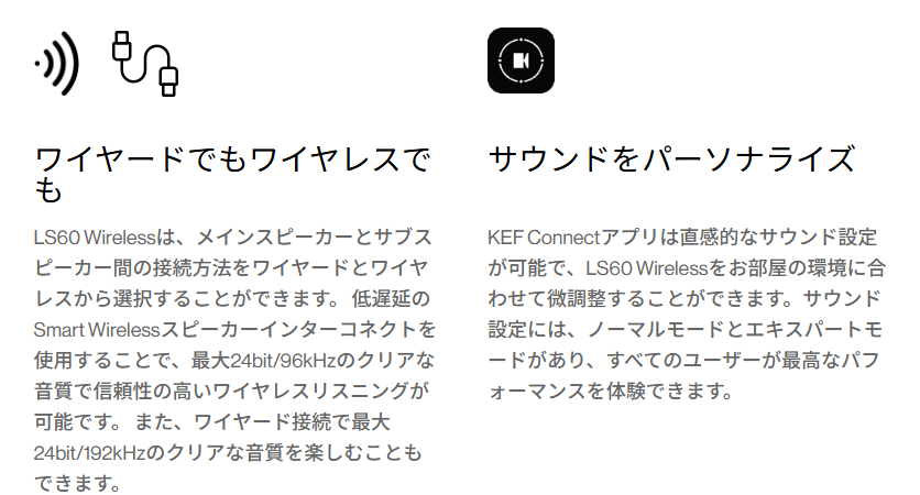 LS60 Wirelessは、より多くのご家庭でハイレゾ音源をお楽しみいただけるよう設計されています。LS60Wirelessは、KEFのキーテクノロジーを結集し、最大24bit/384kHzのハイレゾ相当の音質を実現しています。