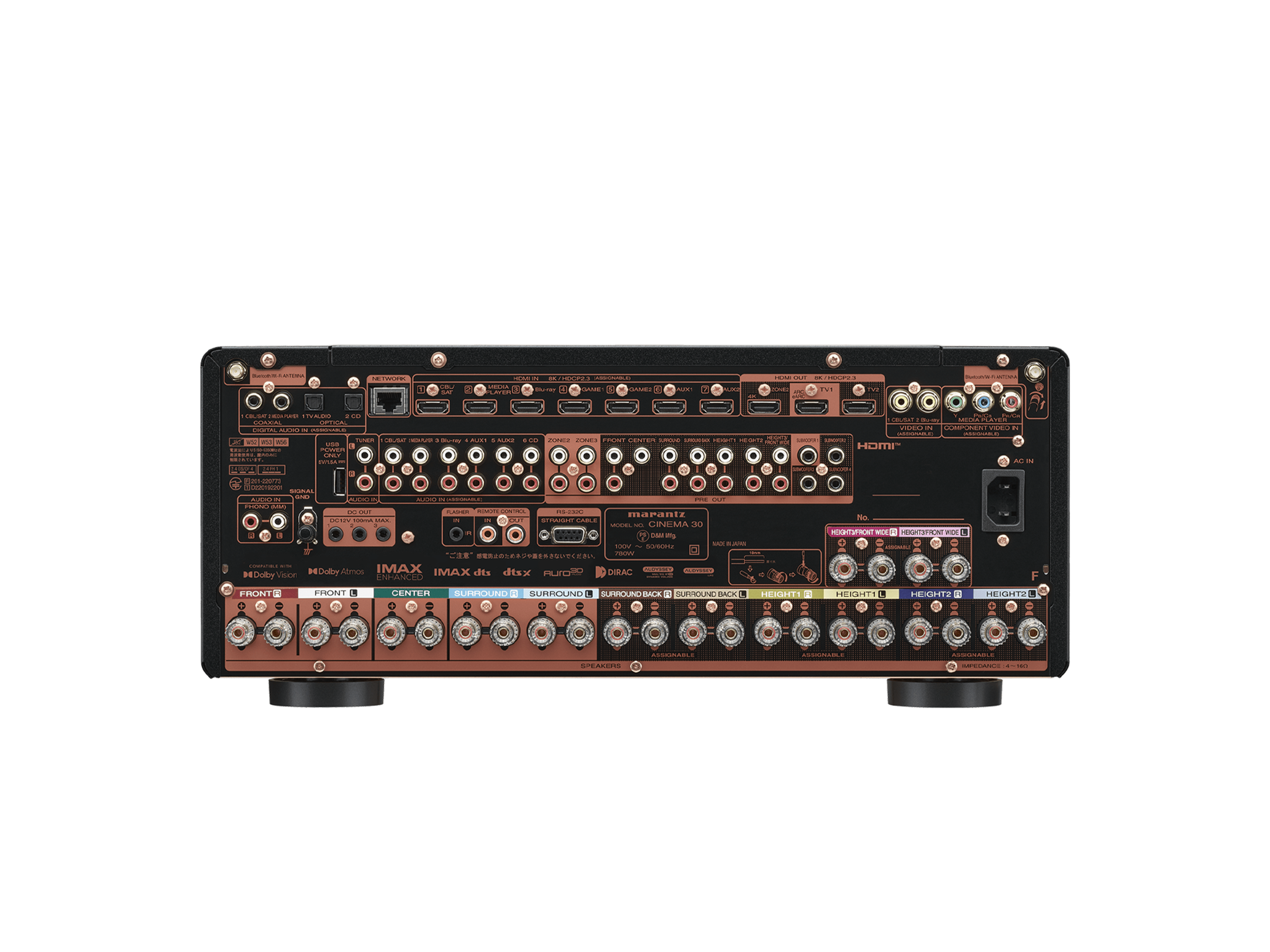 13.4ch のプリアウトを装備しているため、ハイトスピーカーの追加やパワーアンプの強化など、システムの拡張が柔軟に行えます。CINEMA 30 は使用しないパワーアンプを信号ラインから切り離し、高品位なプリアンプとしての使用を可能にする「プリアンプモード」を搭載しています。