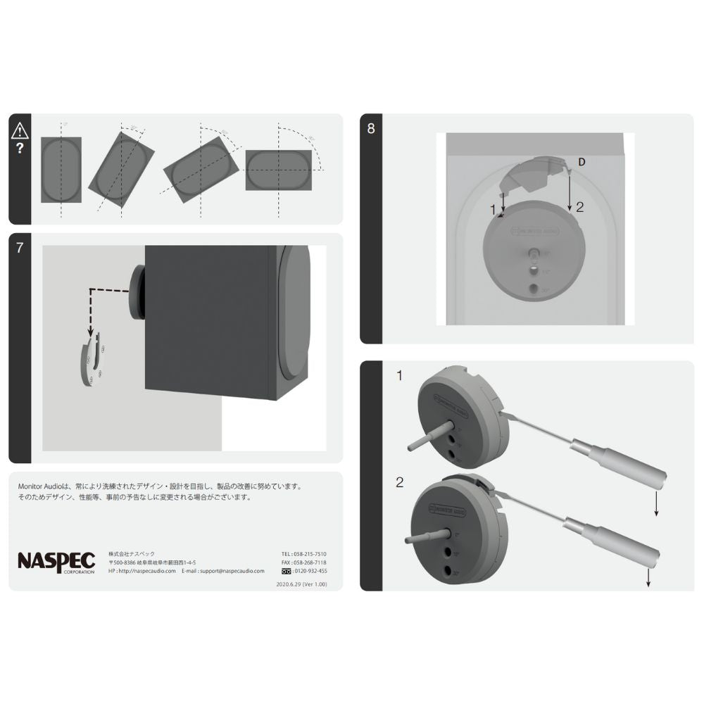 Radius 45 / Radius 90 / Bronze 50-(6G/7G) / Monitor 50 / MASS-2G Satellite 専用ブラケット。中型スピーカーにも対応する頑丈な造りで、簡単且つ素早くスピーカーを取り付けることが可能です。マット塗装の美しい仕上げはブラック(BK)、ホワイト(WH)から、付属のステンレススチールバーは2種類の長さからお選びいただけます。中心から0°、15°、30°の傾斜角度を選び、マウント前面を30°ずつ回転させることでお好みのポジションを選択できるクレバーなデザイン。マウント前面をセットした後、上部から固定用クリップを挿入することで、マウント本体をしっかりと固定します。